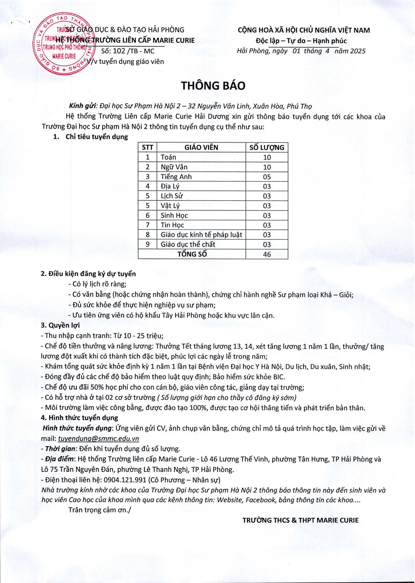 Trường Đại học Sư phạm Hà Nội 2 thông báo tuyển dụng viên chức năm 2024.