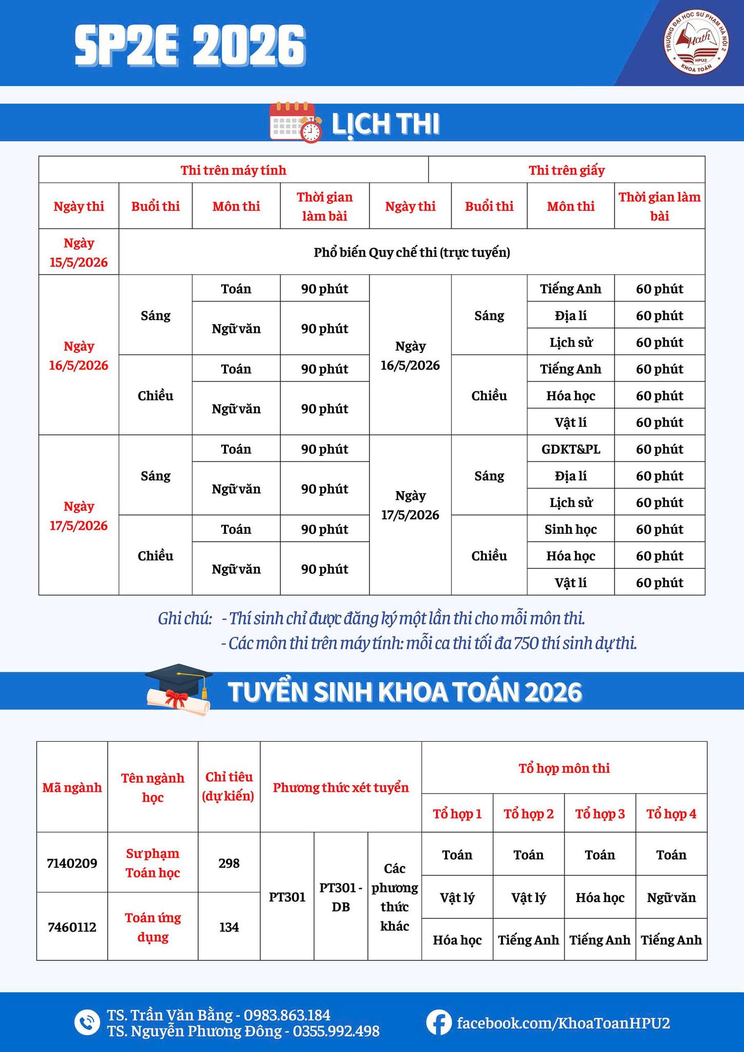 Trường Đại học Sư phạm Hà Nội 2 trân trọng thông báo tổ chức Kỳ thi độc lập tuyển sinh đại học chính quy năm 2026 (SP2E), nhằm tạo thêm cơ hội cho thí sinh trong quá trình xét tuyển vào các ngành đào tạo của Nhà trường.